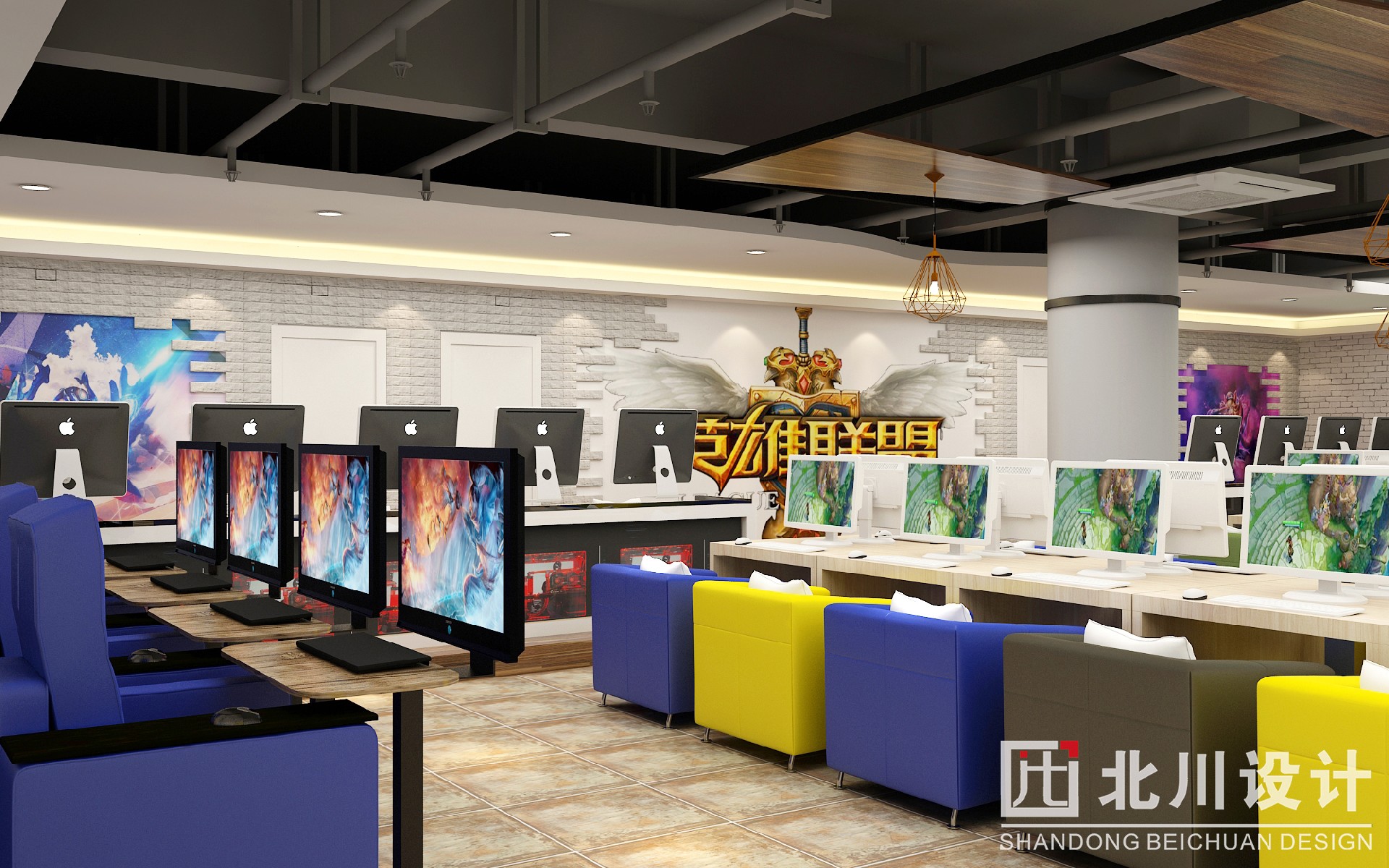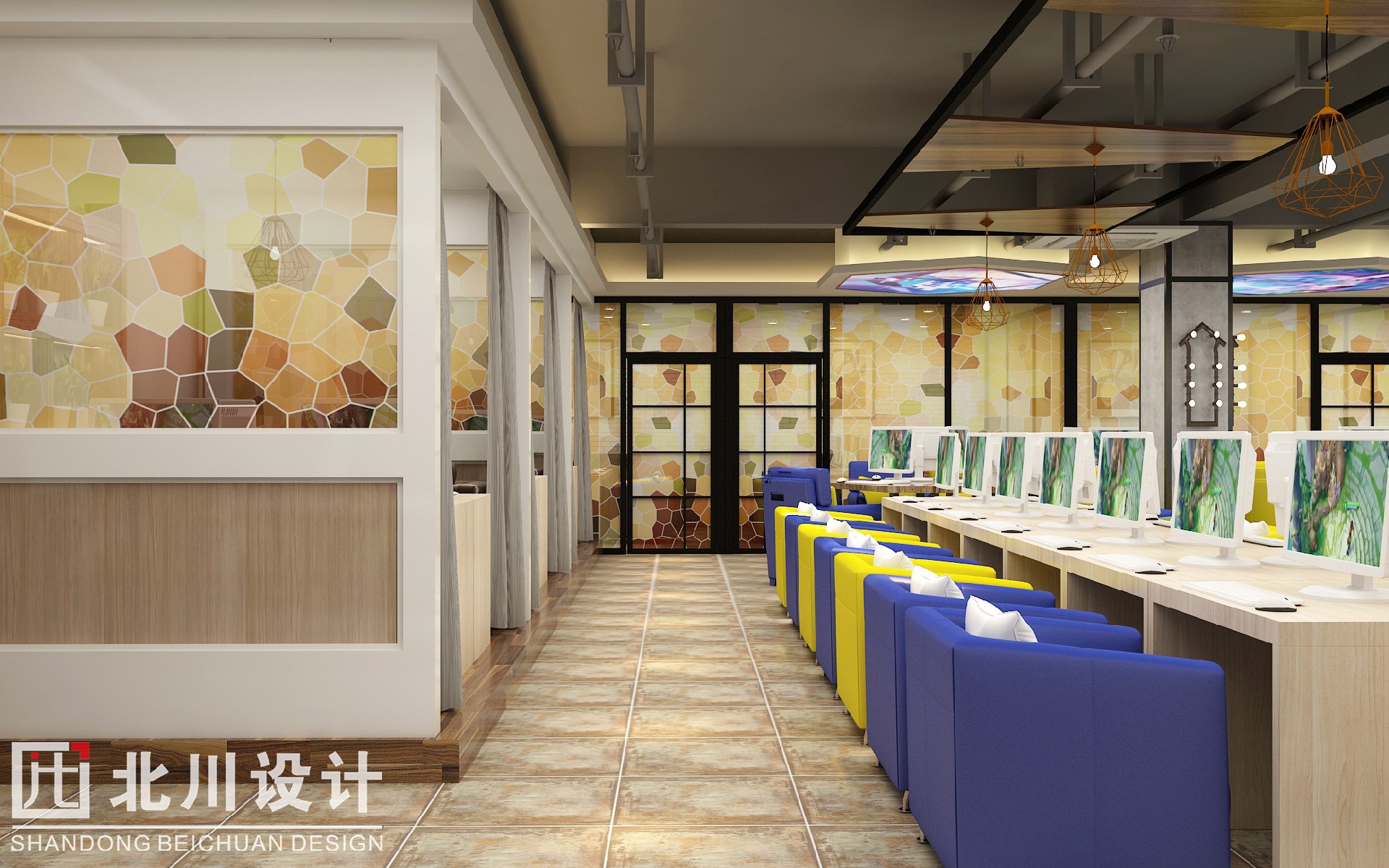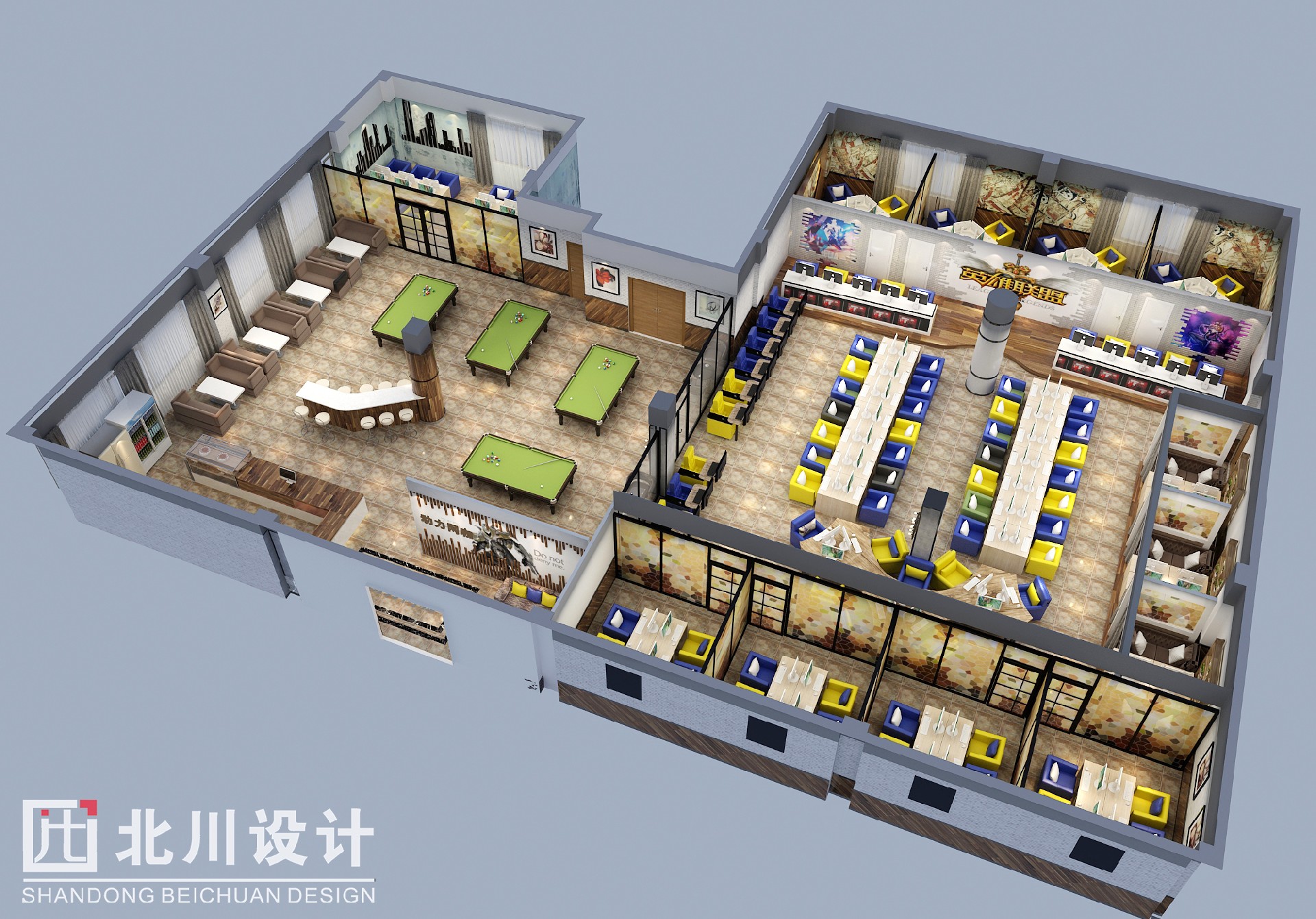 上網(wǎng)綜合大廳為玩游戲、看電影、網(wǎng)聊的玩家專屬區(qū)域,體現(xiàn)干凈整潔,時尚前衛(wèi),與吧臺的設(shè)計互相呼應(yīng)。