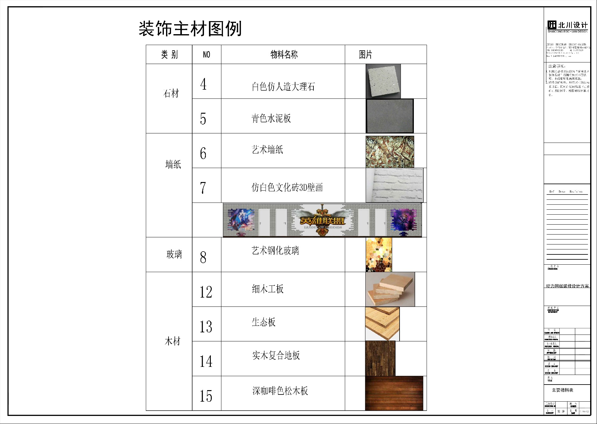 3.色彩搭配,本案的設(shè)計采用較為前衛(wèi)的設(shè)計以體現(xiàn)一種潮流的酷味。在色彩搭配方面主色調(diào)為原木色為主,配以棕色、藍(lán)色、黃色為點綴色。在天花設(shè)計方面,采用了包括了石膏天花造型以及富有工業(yè)特色的原頂和生態(tài)木相搭配符合A級防火規(guī)范。本案的墻面宜采用較為樸素的設(shè)計或者素色的造型設(shè)計,以便突出經(jīng)營的主體(電腦設(shè)備等)。本案的地面設(shè)計主要是仿古磚,一些特殊區(qū)域比如包房采用的木地板。