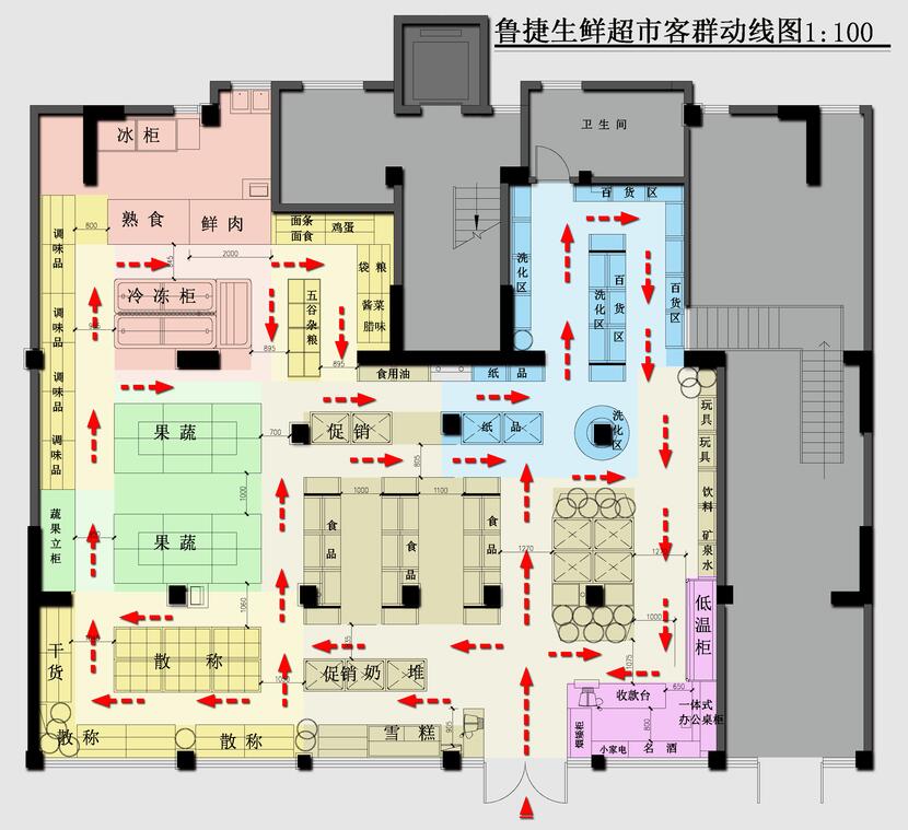 一、平面規(guī)劃:平面布局中重點(diǎn)考慮了本項(xiàng)目的建筑類型,物業(yè)形態(tài)以及項(xiàng)目所在的社區(qū)的客群,消費(fèi)能力,結(jié)合超市固有的特點(diǎn)(如裝修風(fēng)格定位、貨架的樣式、貨架規(guī)格,購物通道大小等的設(shè)置)并考慮超市客群動線的合理性和適當(dāng)延長以及有意避免因建筑戶型限制而形成的購物死角,